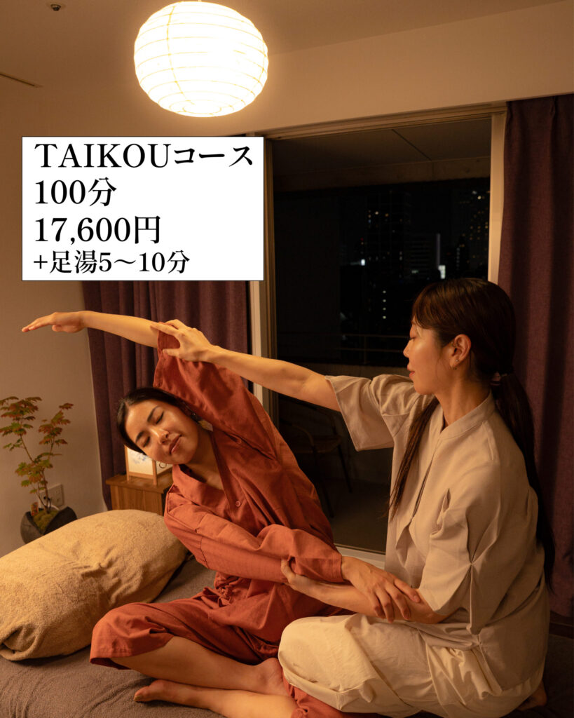 身体をダイナミックに解放する、東洋の「動」の癒し。 心身を深く満たす、西洋の「静」の癒し。 二つの偉大な伝統が出会い、一つの完成された体験へと昇華する。 【TAIKOU】です。